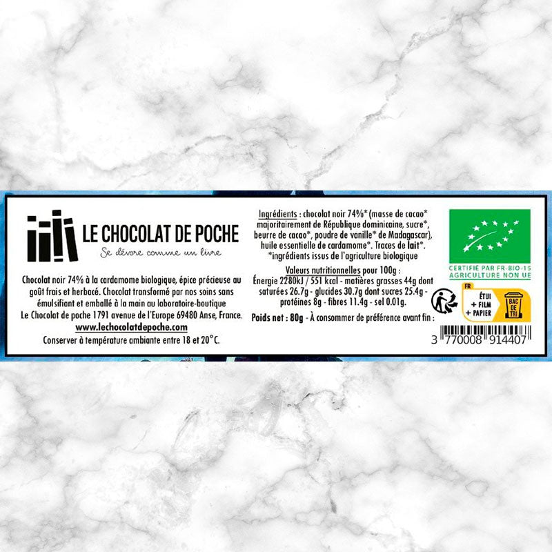 Chocolat noir 74%* (masse de cacao* majoritairement de République dominicaine, sucre*, beurre de cacao*, poudre de vanille* de Madagascar), huile essentielle de cardamome*. Traces possibles de lait*. *ingrédients issus de l'agriculture biologique