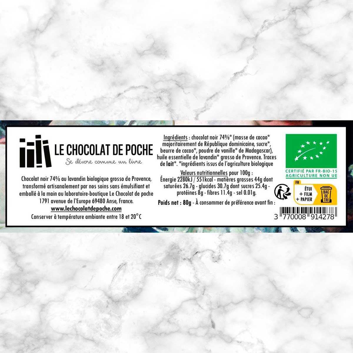 Chocolat noir 74%* (masse de cacao* majoritairement de République dominicaine, sucre*, beurre de cacao*, poudre de vanille* de Madagascar), huile essentielle de lavandin* grosso de Provence. Traces possibles de lait*. *ingrédients issus de l'agriculture biologique