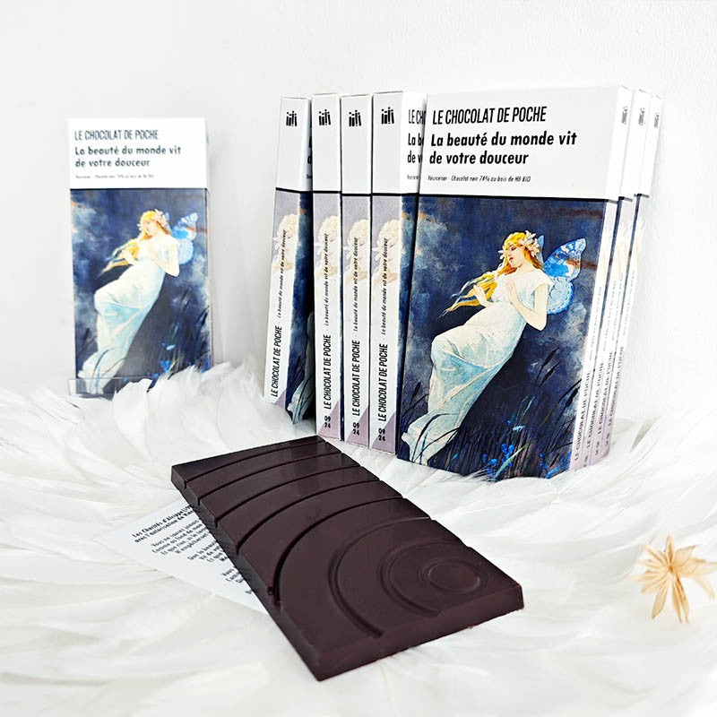 Chaque volume contient de la lecture et un délicieux chocolat BIO transformé par nos soins sans lécithine ni émulsifiant. Le conditionnement et le colisage aussi sont réalisés à la main sans sous-traitance, avec l'amour patient pour le travail véritablement artisanal.