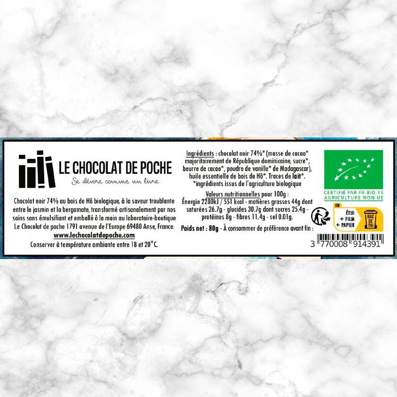 Chocolat noir 74%* (masse de cacao* majoritairement de République dominicaine, sucre*, beurre de cacao*, poudre de vanille* de Madagascar), huile essentielle de bois de Hô*. Traces possibles de lait*. *ingrédients issus de l'agriculture biologique
