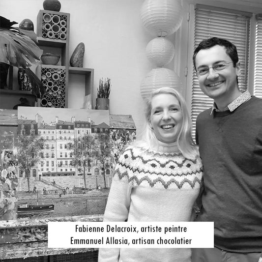 Fabienne Delacroix, artiste peintre figuratif de la Belle Époque. Vous l'apercevez en photo aux côtés d'Emmanuel Allasia artisan et fondateur du Chocolat de poche. Plusieurs de ses oeuvres ornent actuellement les références noir grué de cacao Blériot, noir pain d'épices Notre-Dame, noir lacté (Avent) et le diptyque de Noël.