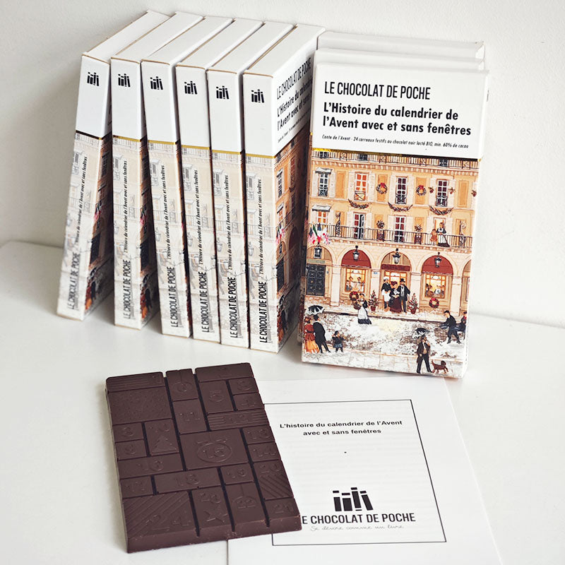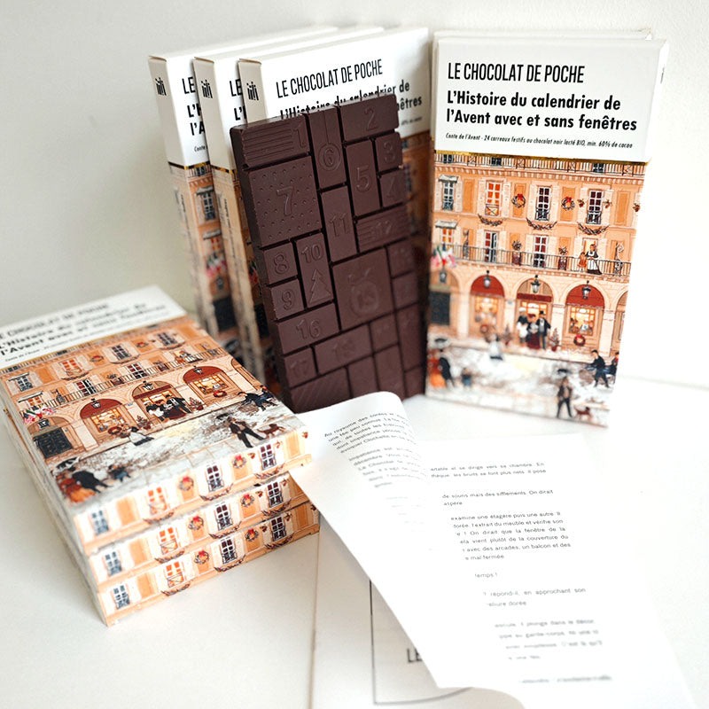 Il était une fois un calendrier qui revisite en plus grand format la tablette de chocolat littéraire Le Chocolat de poche. Le chocolat noir lacté bio minimum 60% de cacao composé de 24 carreaux numérotés et festifs se glisse dans un étui en forme de livre avec un titre, une couverture mais sans les 24 fenêtres emblématiques des calendriers de l’Avent traditionnels.