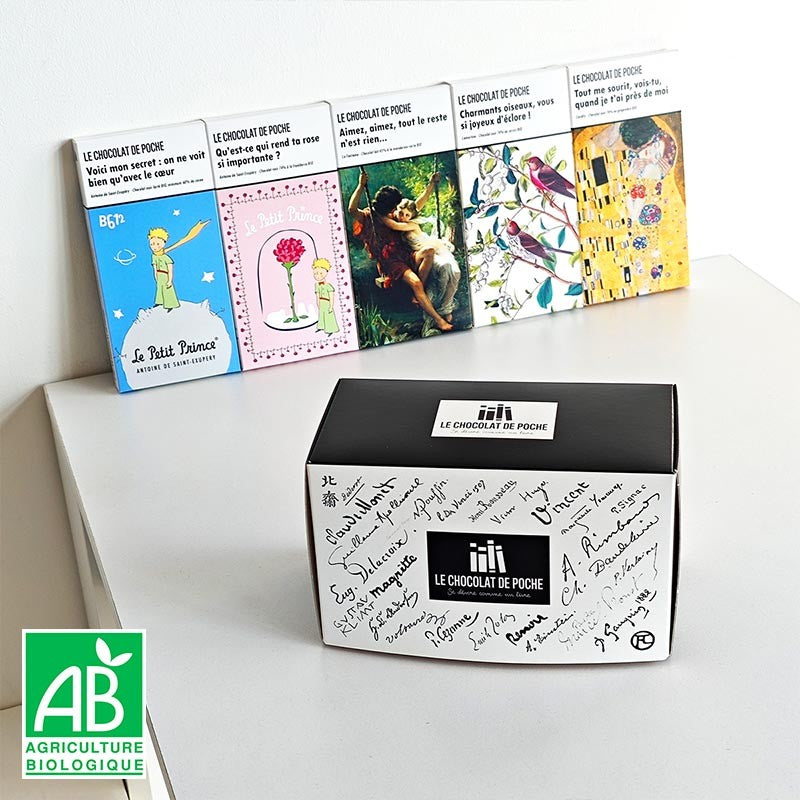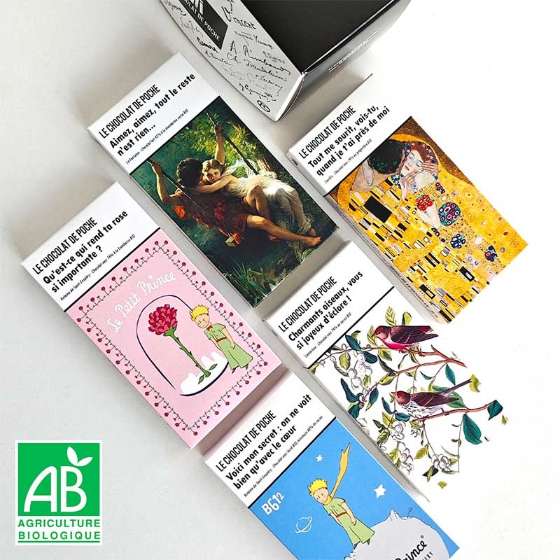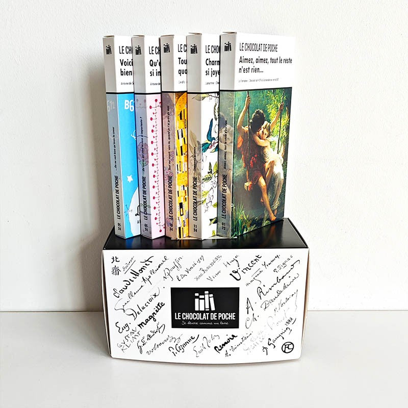Ce coffret Cupidon orné des signatures de peintres et d'auteurs qui inspirent Le Chocolat de poche, renferme une sélection de 5 tablettes-livres sur le thème de l'amour :