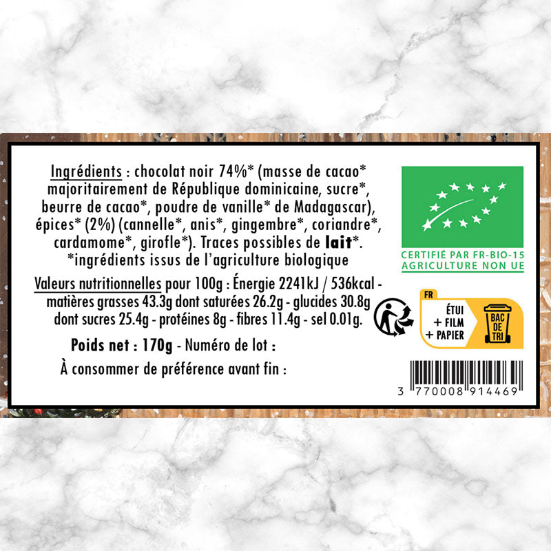 Grande tablette noir 74% au pain d'épices BIO - 170g nets : Chocolat noir* 74% (masse de cacao* majoritairement de République dominicaine, sucre*, beurre de cacao*, poudre de vanille* de Madagascar), épices* (2%) (cannelle*, anis*, gingembre*, coriandre*, cardamome*, girofle*). Traces possibles de lait*. *ingrédients issus de l'agriculture biologique.