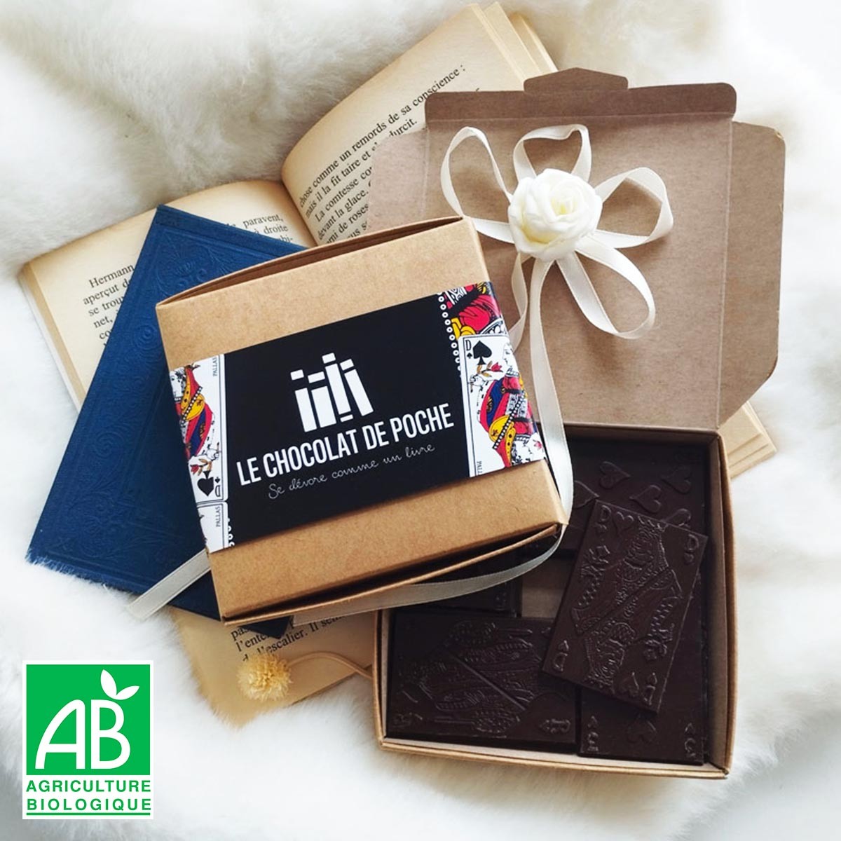 Chaque Chocolat de poche contient de la lecture associée à un délicieux chocolat BIO transformé par nos soins sans lécithine ni émulsifiant.