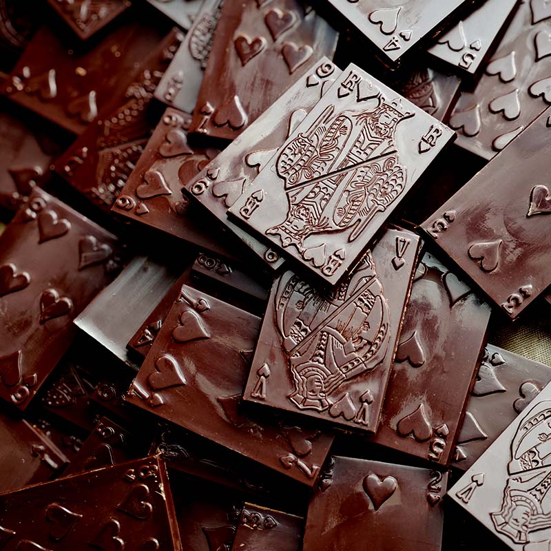 Pour accompagner la lecture, des chocolats fins en forme de cartes à jouer se glissent dans l'étui cartonné, réalisé sans plastique. Un format de chocolat idéal pour accompagner le café, le tout fait main, en bio avec pour origine principale la République dominicaine.
