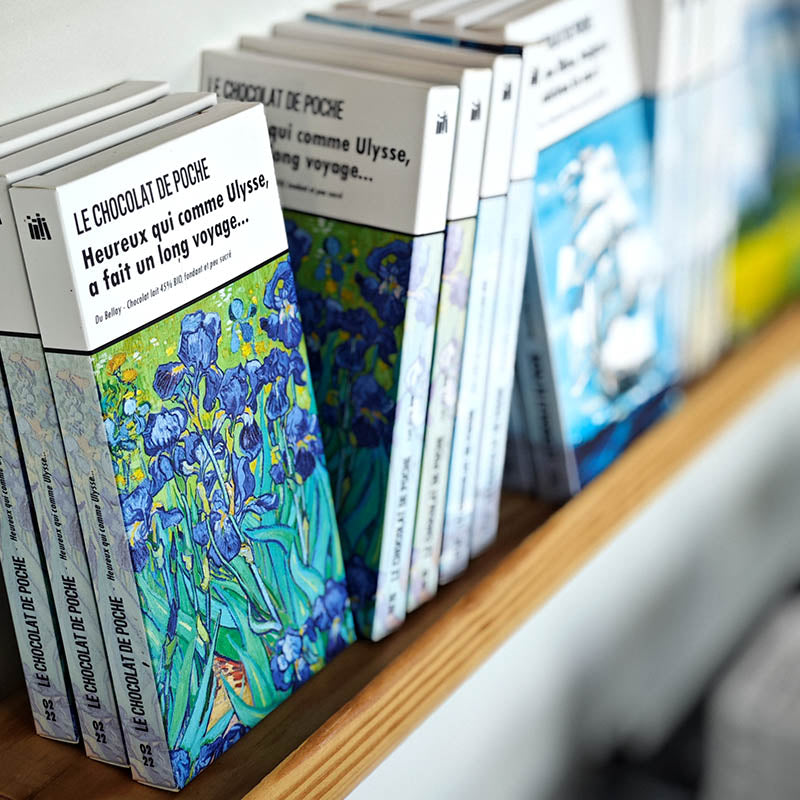 Cette tablette-livre ornée des Iris de Van Gogh est associée à l'un des plus célèbres poèmes de Du Bellay. Savourez-le avec un chocolat au lait 45% au fondant somptueux, peu sucré, certifié BIO, sans lécithine.