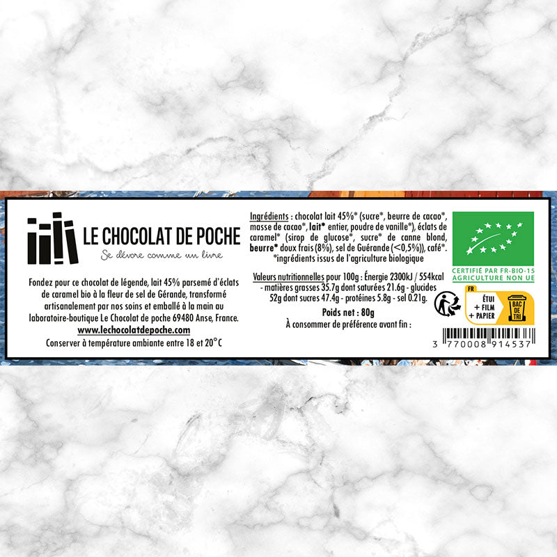 Chocolat au lait 45% (sucre*, beurre de cacao*, masse de cacao*, lait* entier, poudre de vanille*), éclats de caramel* (sirop de glucose*, sucre* de canne blond, beurre* doux frais (8%), sel de Guérande (<0,5%)), café*. *ingrédients issus de l'agriculture biologique