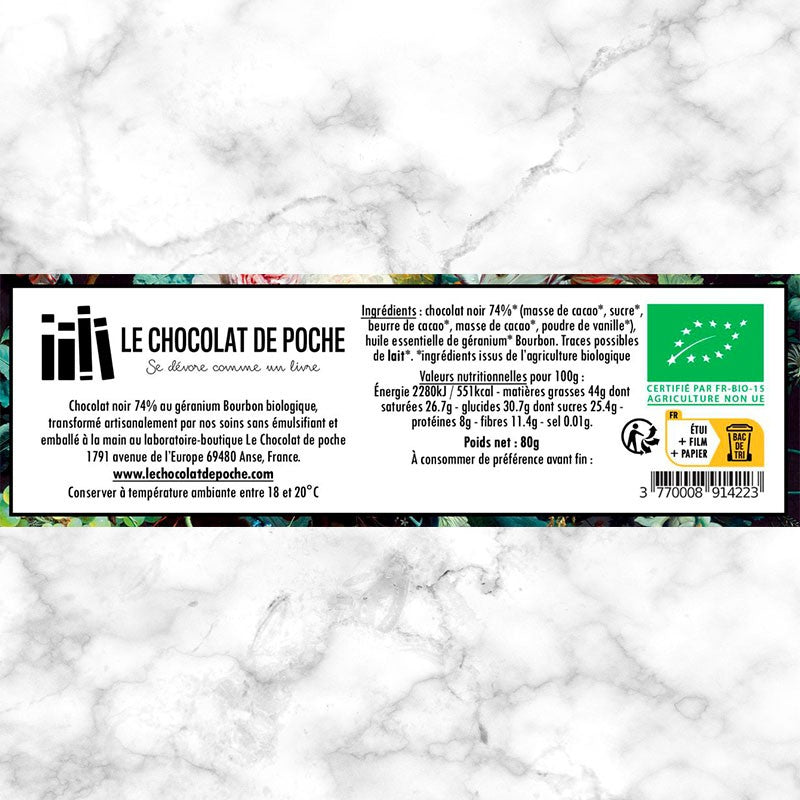 Chocolat noir 74%* (masse de cacao* majoritairement de République dominicaine, sucre*, beurre de cacao*, poudre de vanille* de Madagascar), huile essentielle de geranium* Bourbon. Traces possibles de lait*. *ingrédients issus de l'agriculture biologique