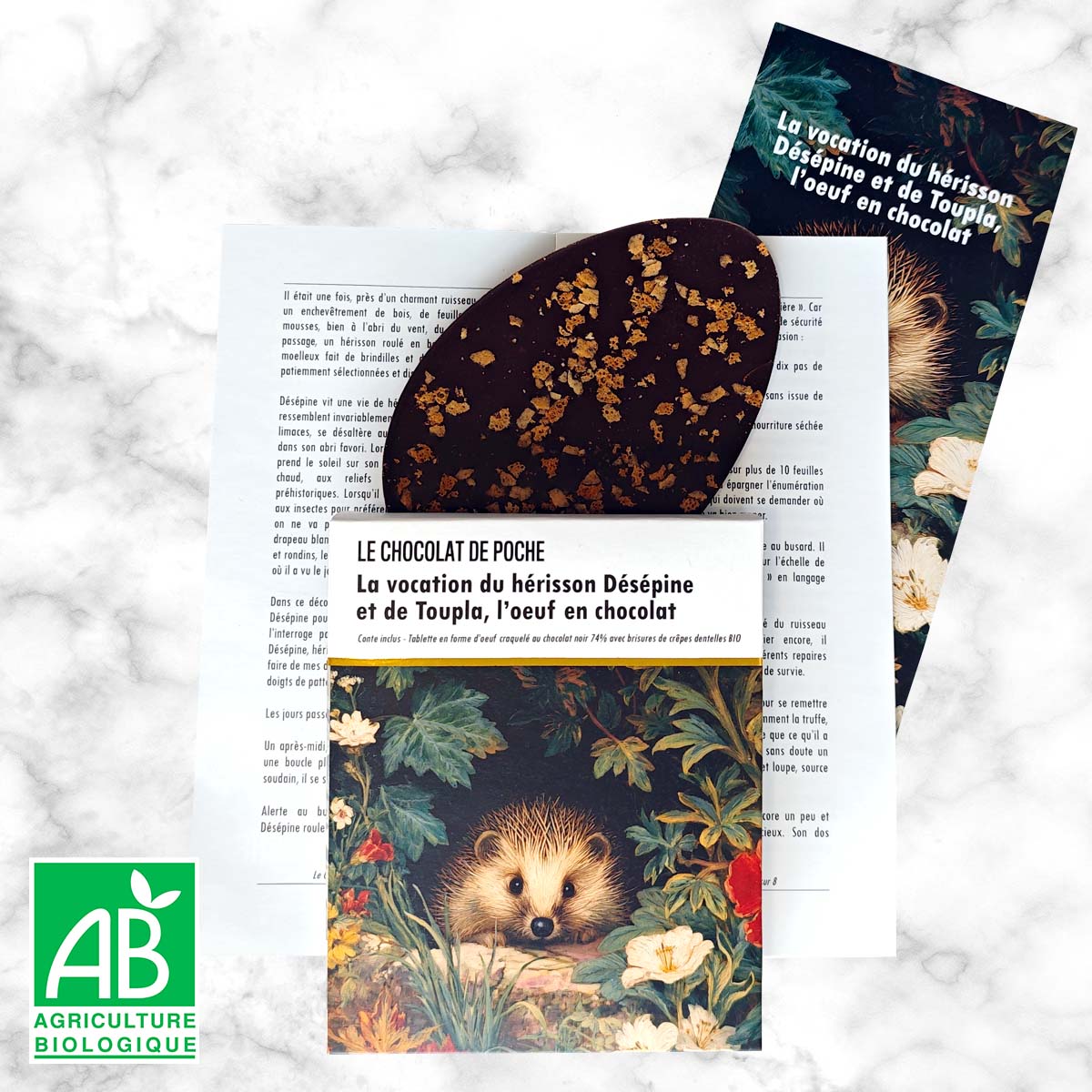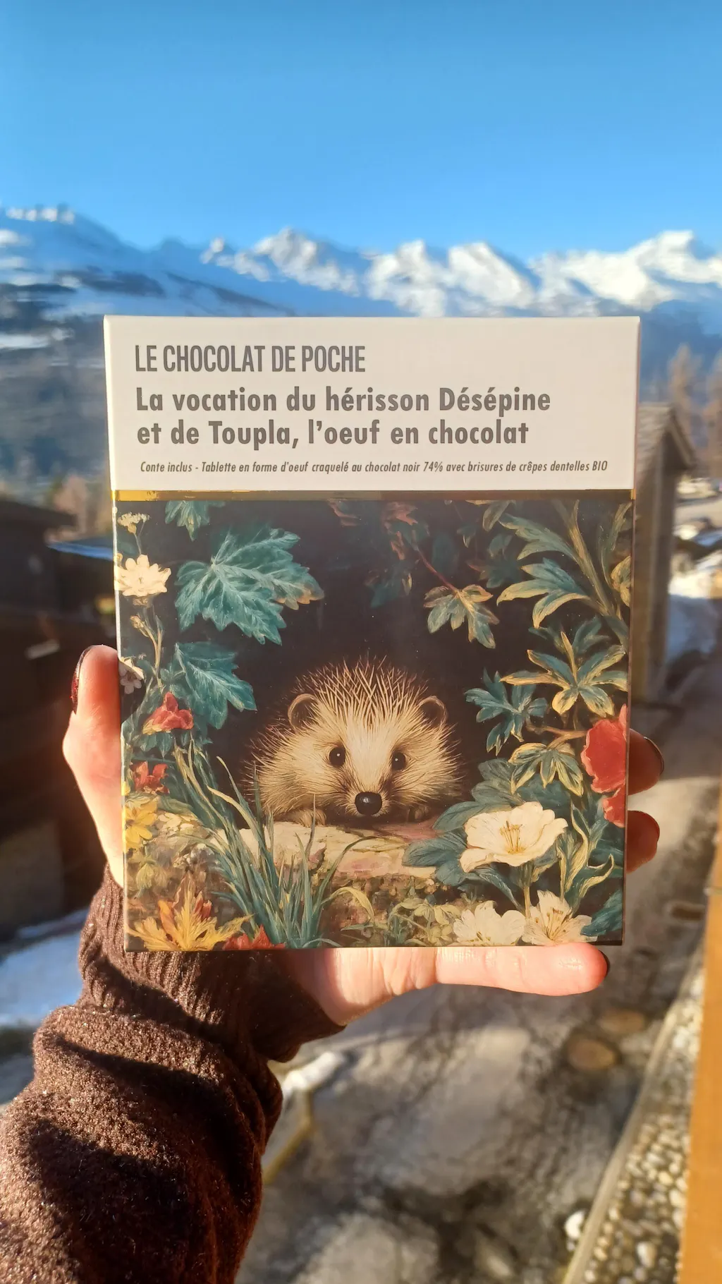 Noir 74% crêpes dentelles BIO - La vocation du hérisson Désépine et de Toupla, l'oeuf en chocolat
