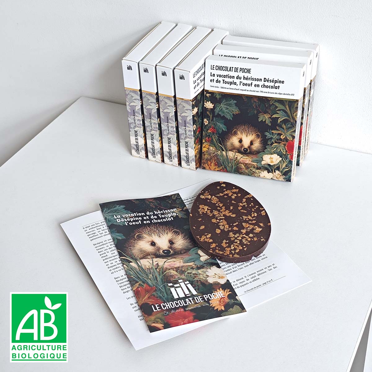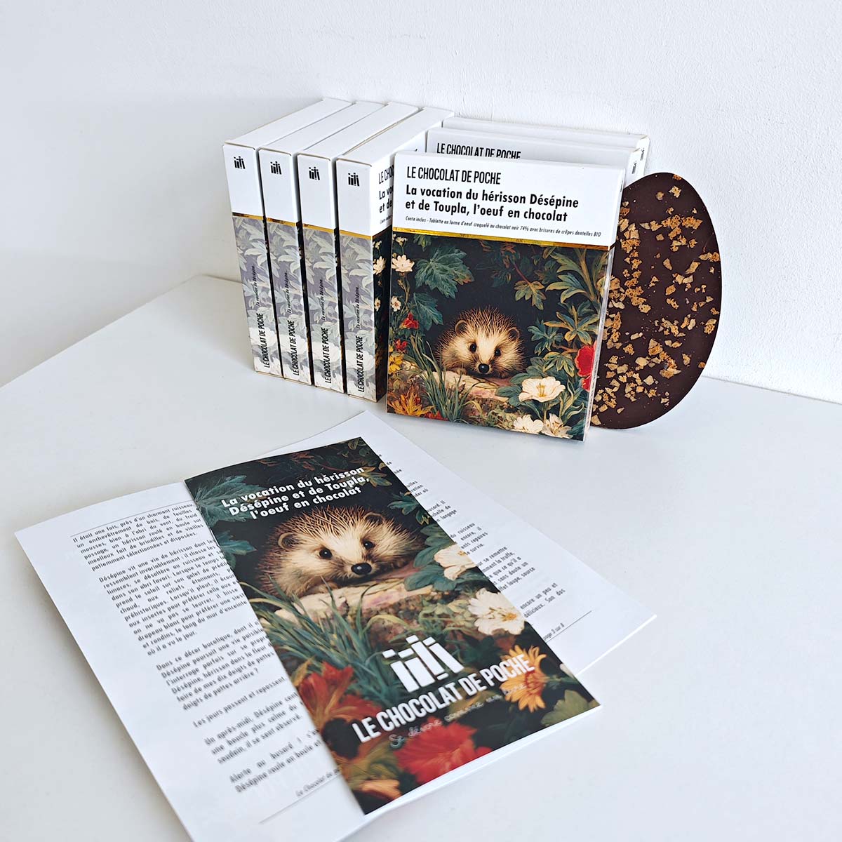 Chaque volume contient de la lecture et un délicieux chocolat BIO transformé par nos soins sans lécithine ni émulsifiant. Le conditionnement et le colisage aussi sont réalisés à la main sans sous-traitance, avec l'amour patient pour le travail véritablement artisanal.