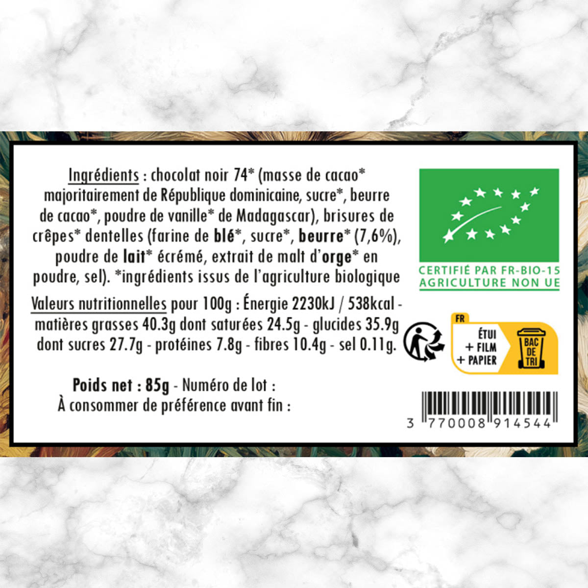 Chocolat noir* minimum 74% (masse de cacao* majoritairement de République dominicaine, sucre*, beurre de cacao*, poudre de vanille* de Madagascar), brisures de crêpes dentelles (farine de blé*, sucre*, beurre* (7,6%), poudre de lait* écrémé, extrait de malt d'orge* en poudre, sel). *ingrédients issus de l'agriculture biologique.
