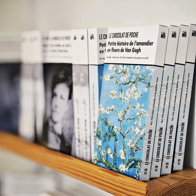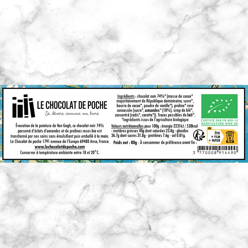Noir 74% éclats d'amandes et de pralines roses BIO - Petite histoire de l'amandier en fleurs de Van Gogh