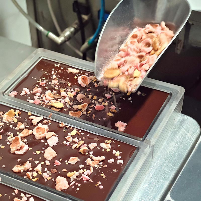 Chocolat noir 74%* (masse de cacao* majoritairement de République dominicaine, sucre*, beurre de cacao*, poudre de vanille* de Madagascar), praline* rose concassée (sucre*, amandes* (18%), sirop de blé*, concentré (radis, carotte*)). Traces possibles de lait*. *ingrédients issus de l'agriculture biologique