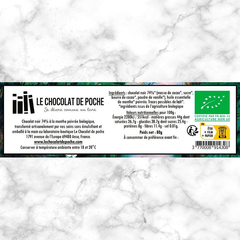 Chocolat noir 74%* (masse de cacao* majoritairement de République dominicaine, sucre*, beurre de cacao*, poudre de vanille* de Madagascar), huile essentielle de menthe* poivrée. Traces possibles de lait*. *ingrédients issus de l'agriculture biologique